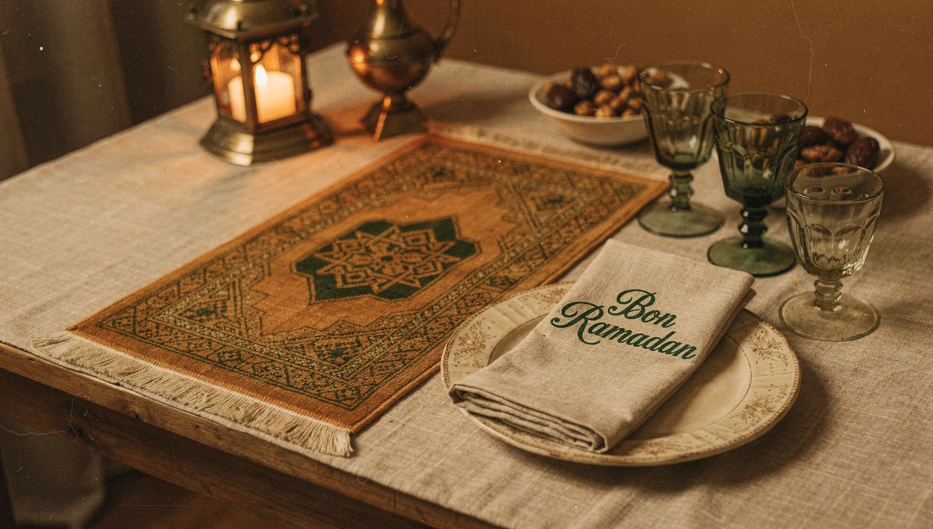 Découvrez notre collection raffinée de tapis de prière personnalisés, d'art de la table élégante, les délices du Ramadan et de coffrets cadeaux pensés pour sublimer vos moments sacrés.